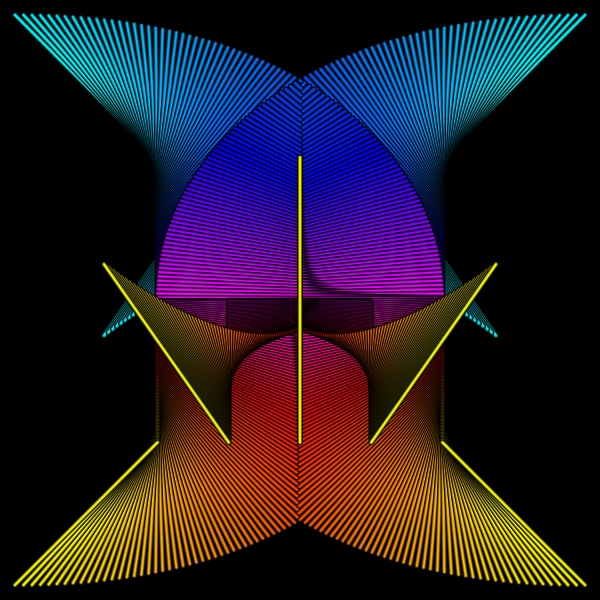 This image represents points (x,y) that satisfy the equation: π = 3 tan-1(y1/x1) + tan-1(y2/x2). The image is made up of a series of lines. One end of the line is the point (x1,y1) and (x2,y2) is the other end. © 2013 Kerry Mitchell